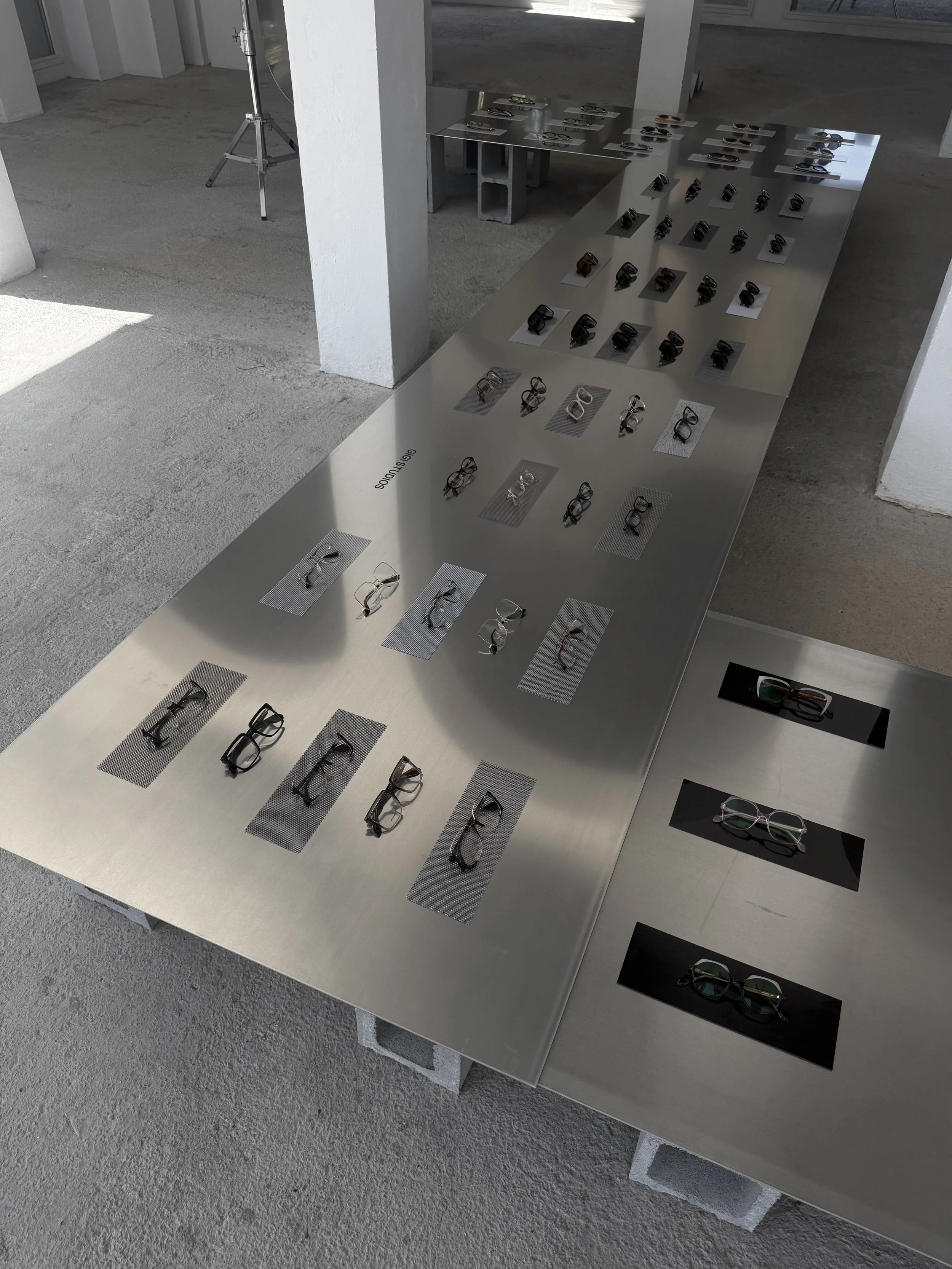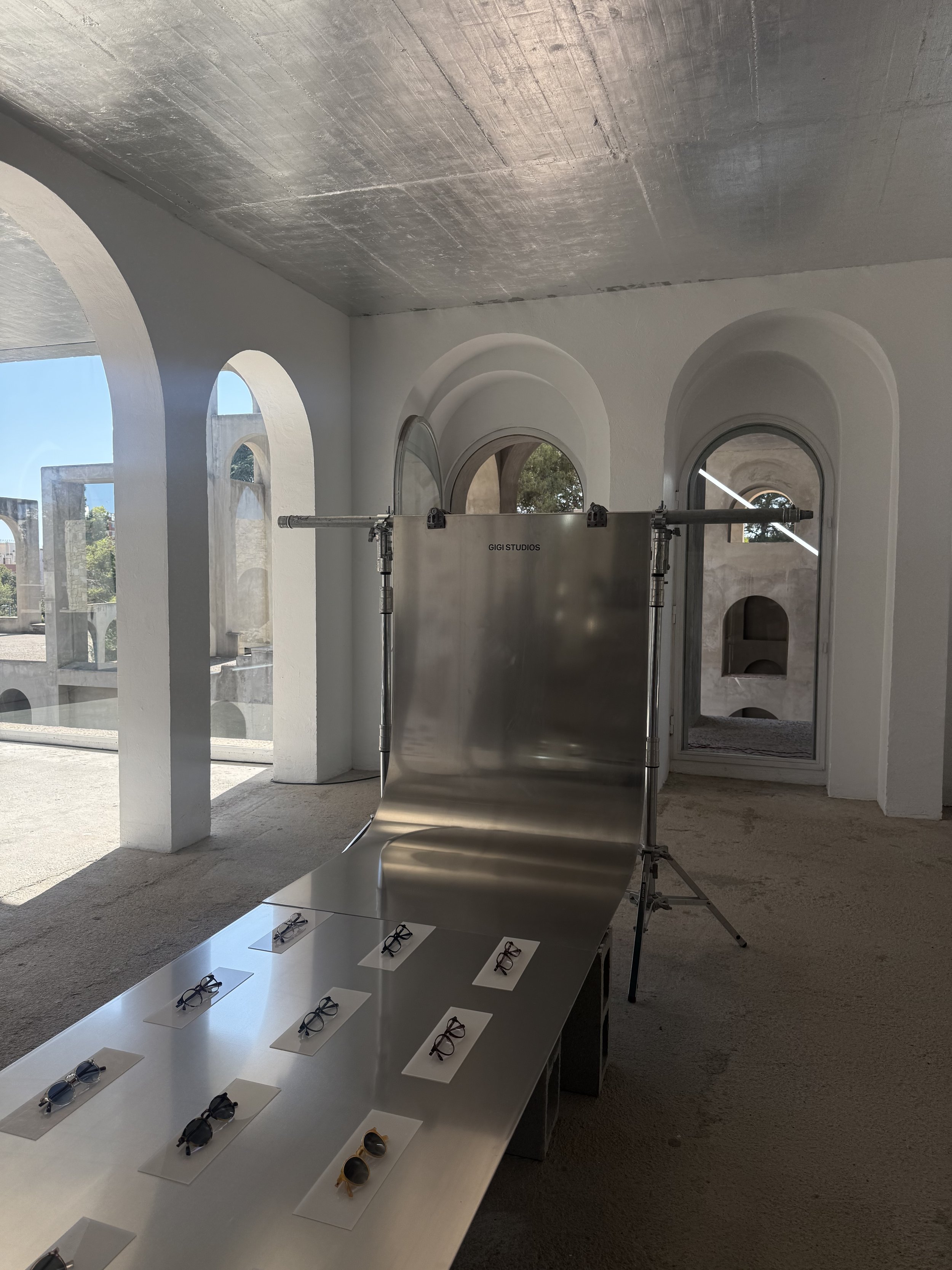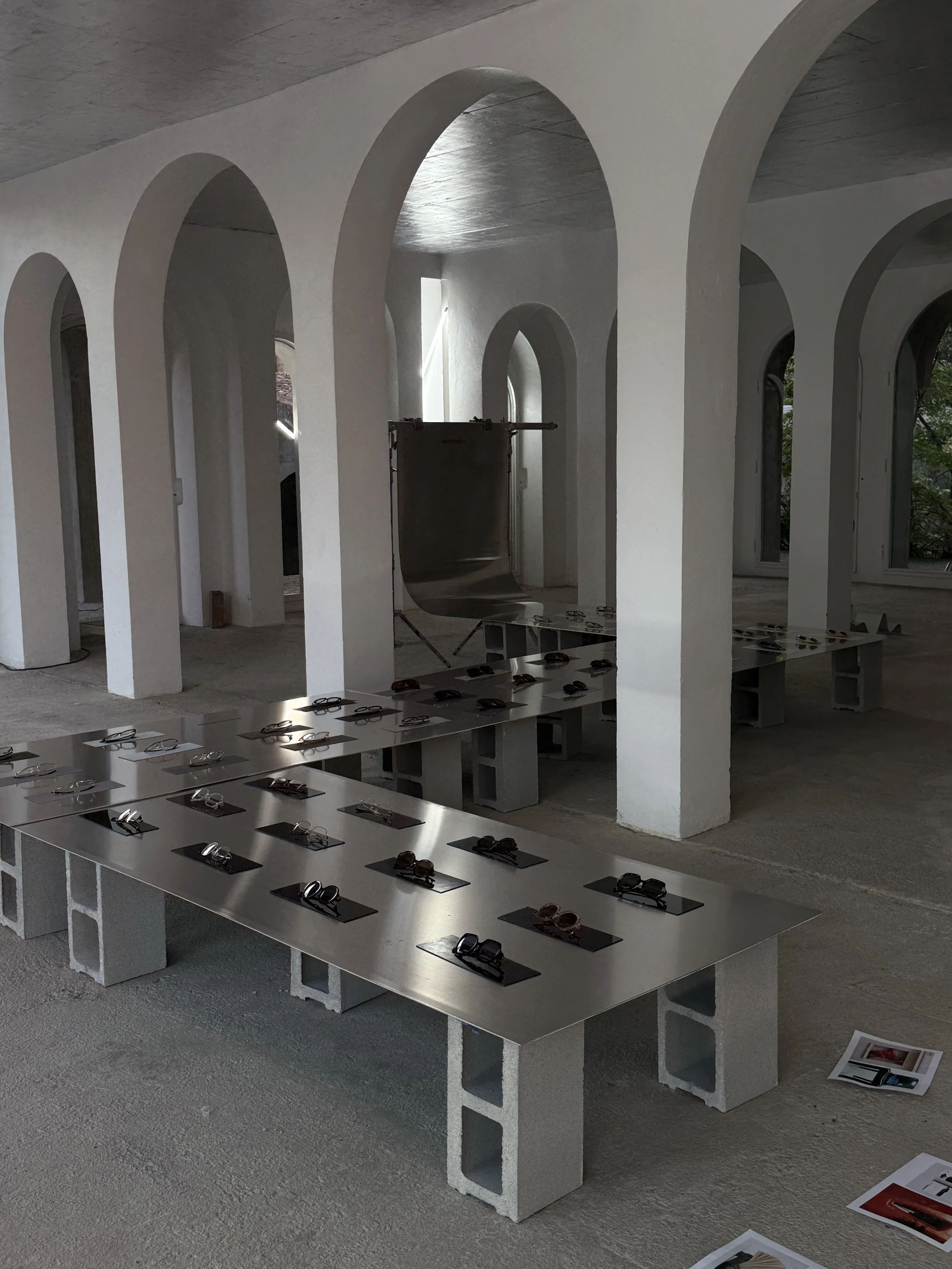 The installation spans four distinct areas of the site, each adapting to the spatial rhythm of its surroundings. Silver-toned volumes frame and elevate the eyewear collection by Gigi Studios and Atlant , offering moments of stillness and contrast within the complexity of the environment.