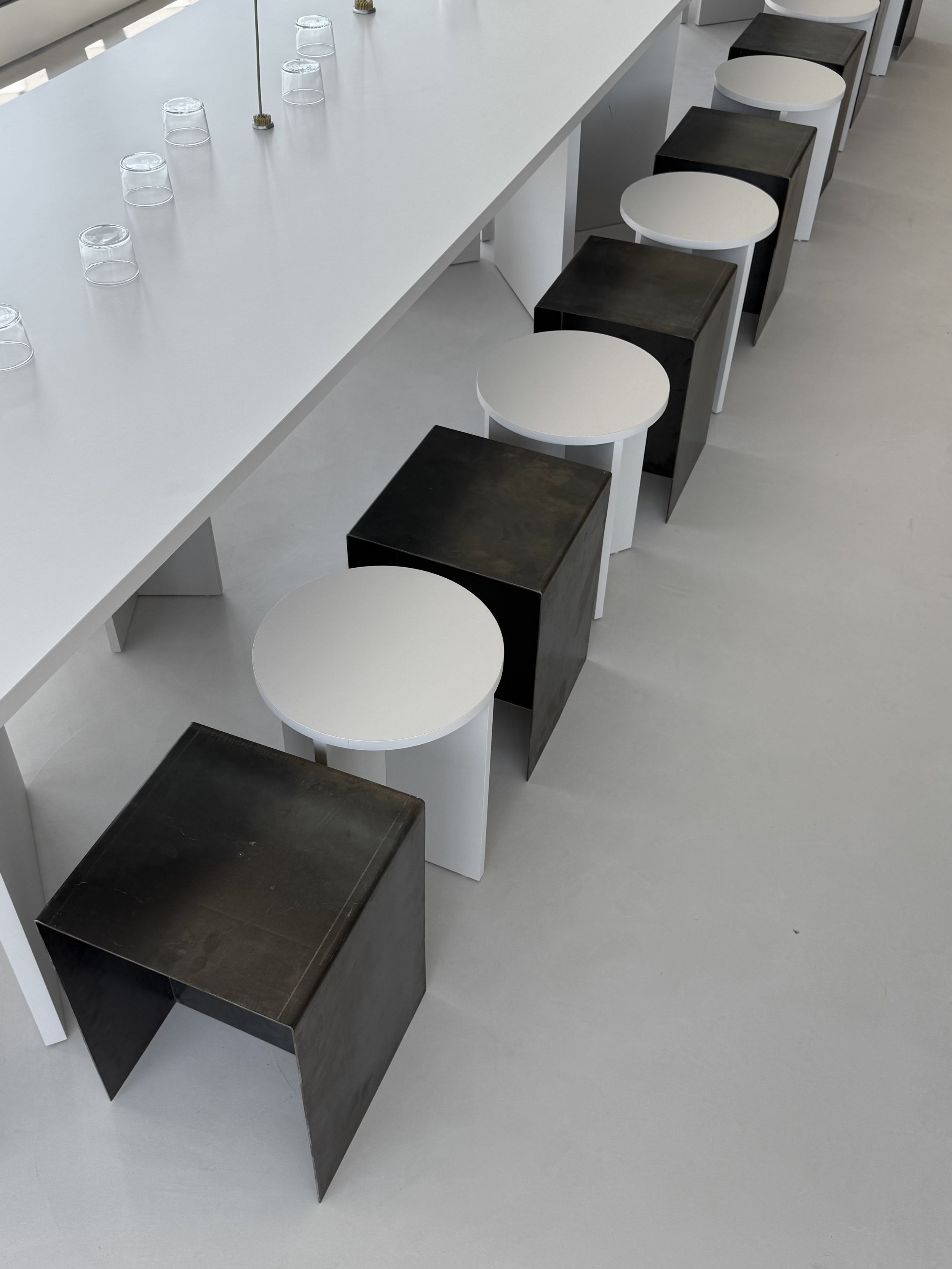 A raw, modular system in metal and shadow is developed in response to the architecture of Espai Xavier Corberó. The design reflects Barcelona’s creative legacy—concrete, metal, light, and negative space—interpreted through restrained materials and structural clarity.